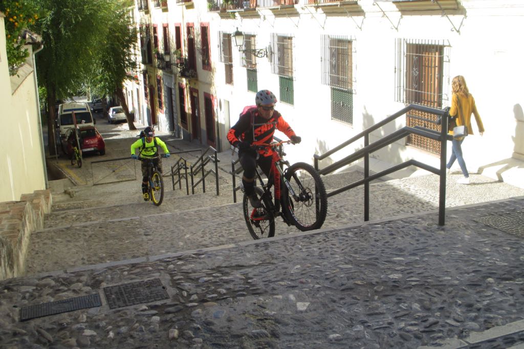 El comienzo de la ruta me dio que pensar… Salimos desde Puente Verde. Junto a EMASAGRA hay unas escalerillas, que un día, hace ya años, se las vi hacer a mi amigo Vicente. Aquello me impresiono. Un tío montao en bici, subiendo ese montón de escaleras, no puede ser normal…