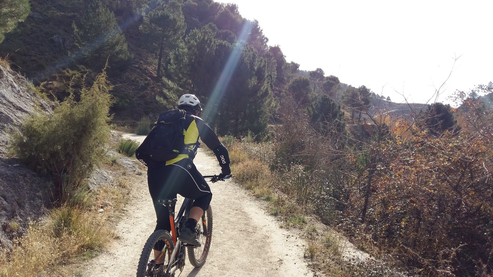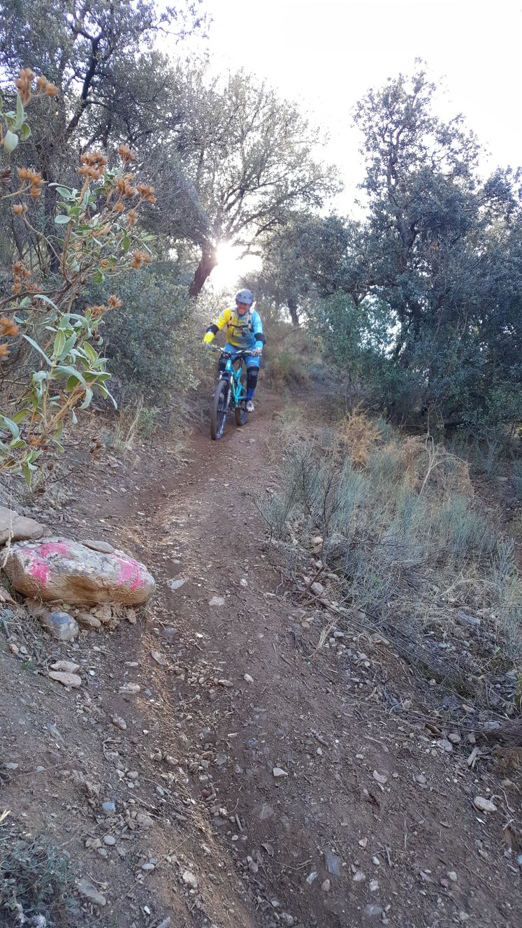 Al empezar la bajada, el terreno está muy muy suelto, y con mucho canto rodado, y al bueno de Sebas se le fue la rueda delantera, y se pegó en un costado con una piedra, haciéndose algo de daño. Este chico es un valiente. La primera ruta de este tipo que hace, con su nueva bici, y no nos ha mandado a tomarpor….A mi me meten mis colegas, la primera vez que hago vereas, por estos sitios y les retiro la palabra, como poco, jajajaja, pero el tío ha aguantado como un campeón.