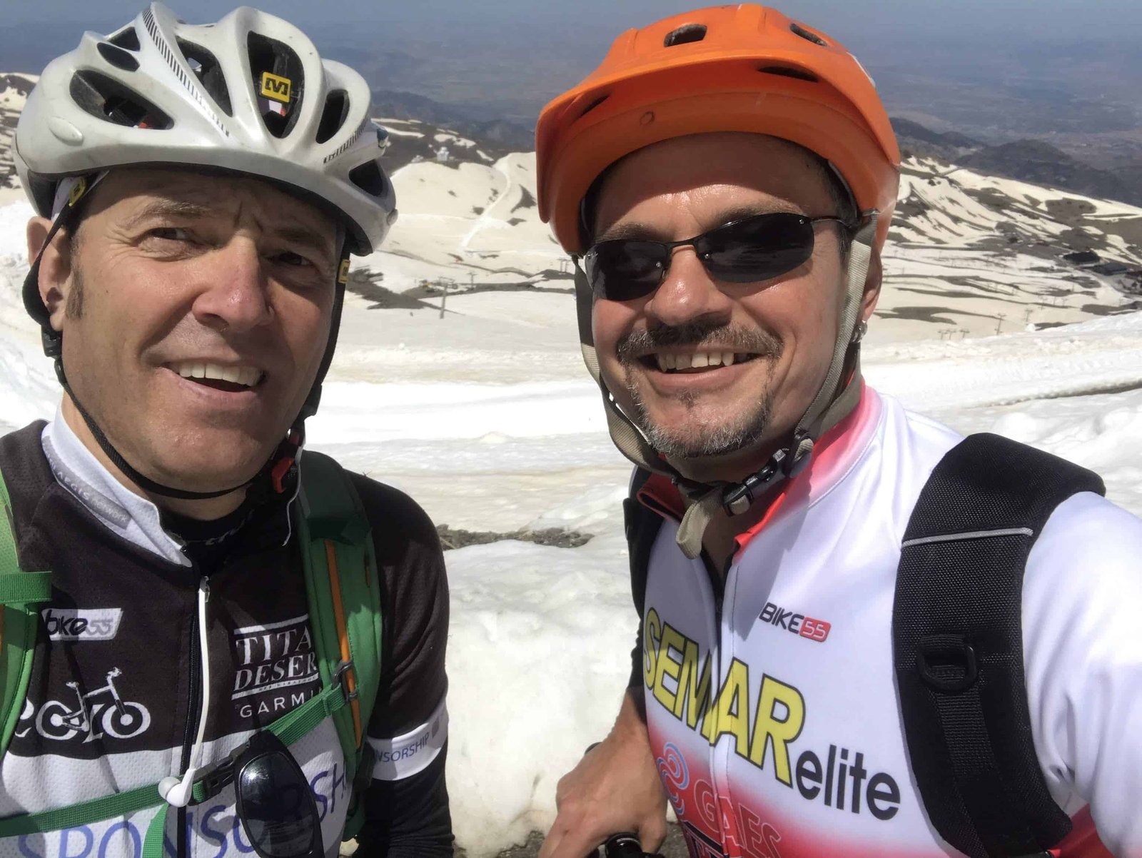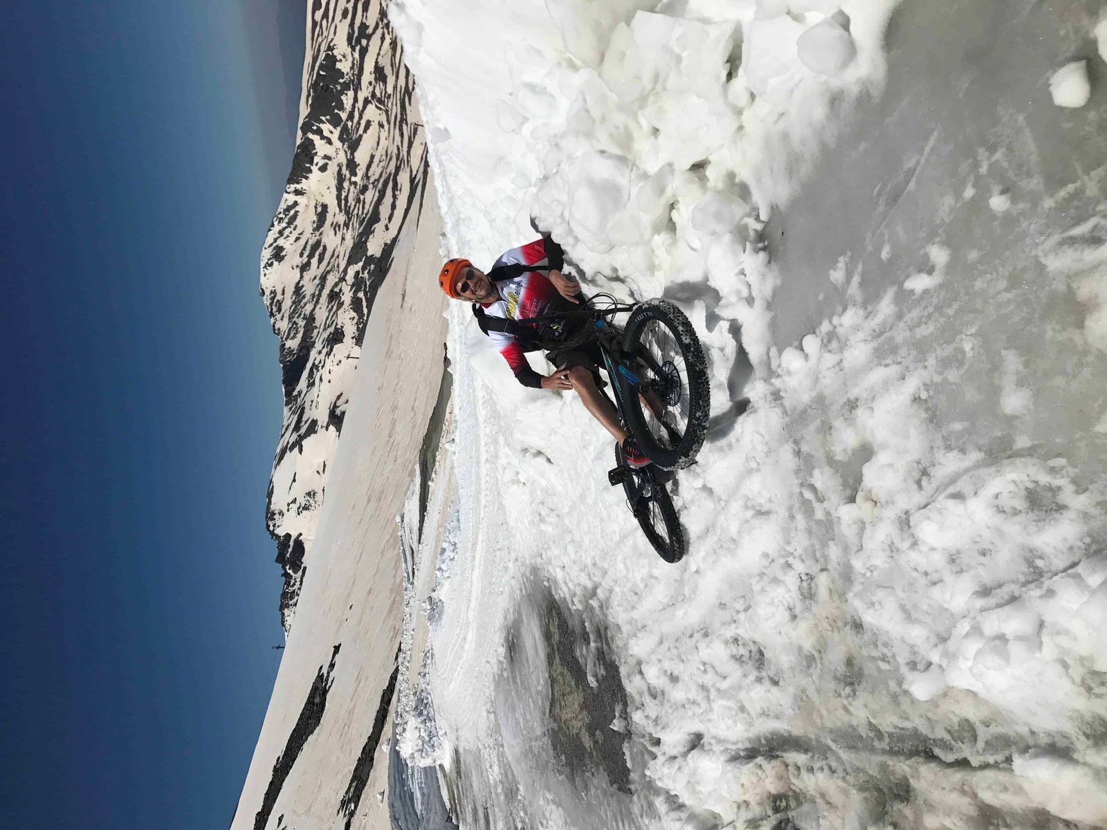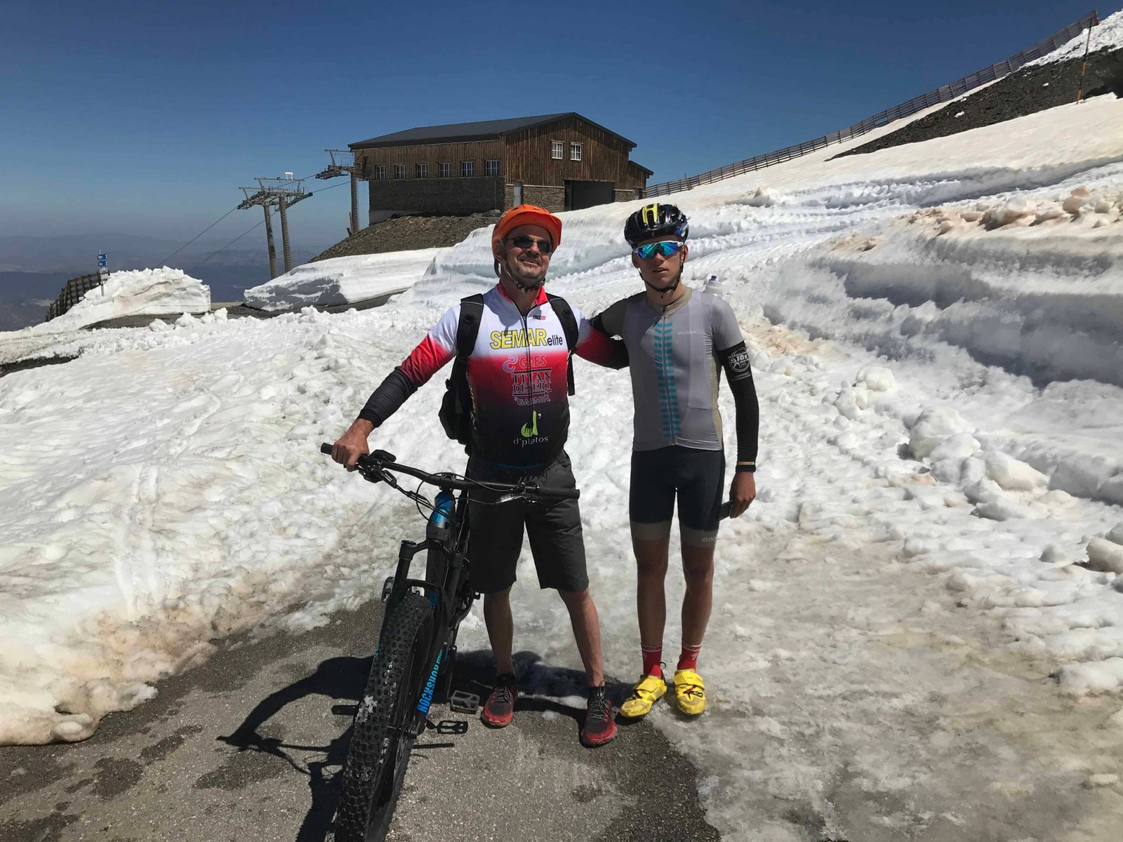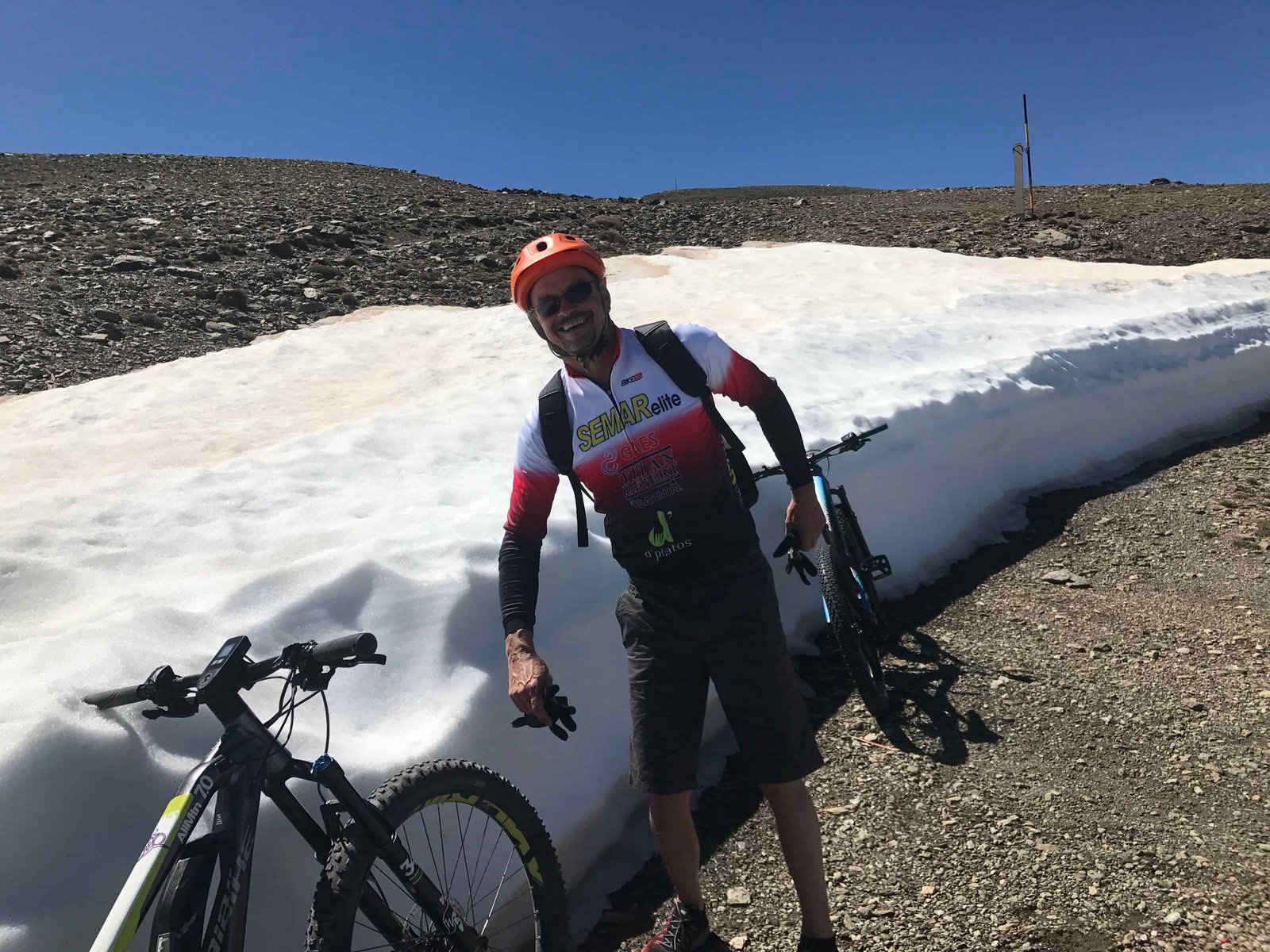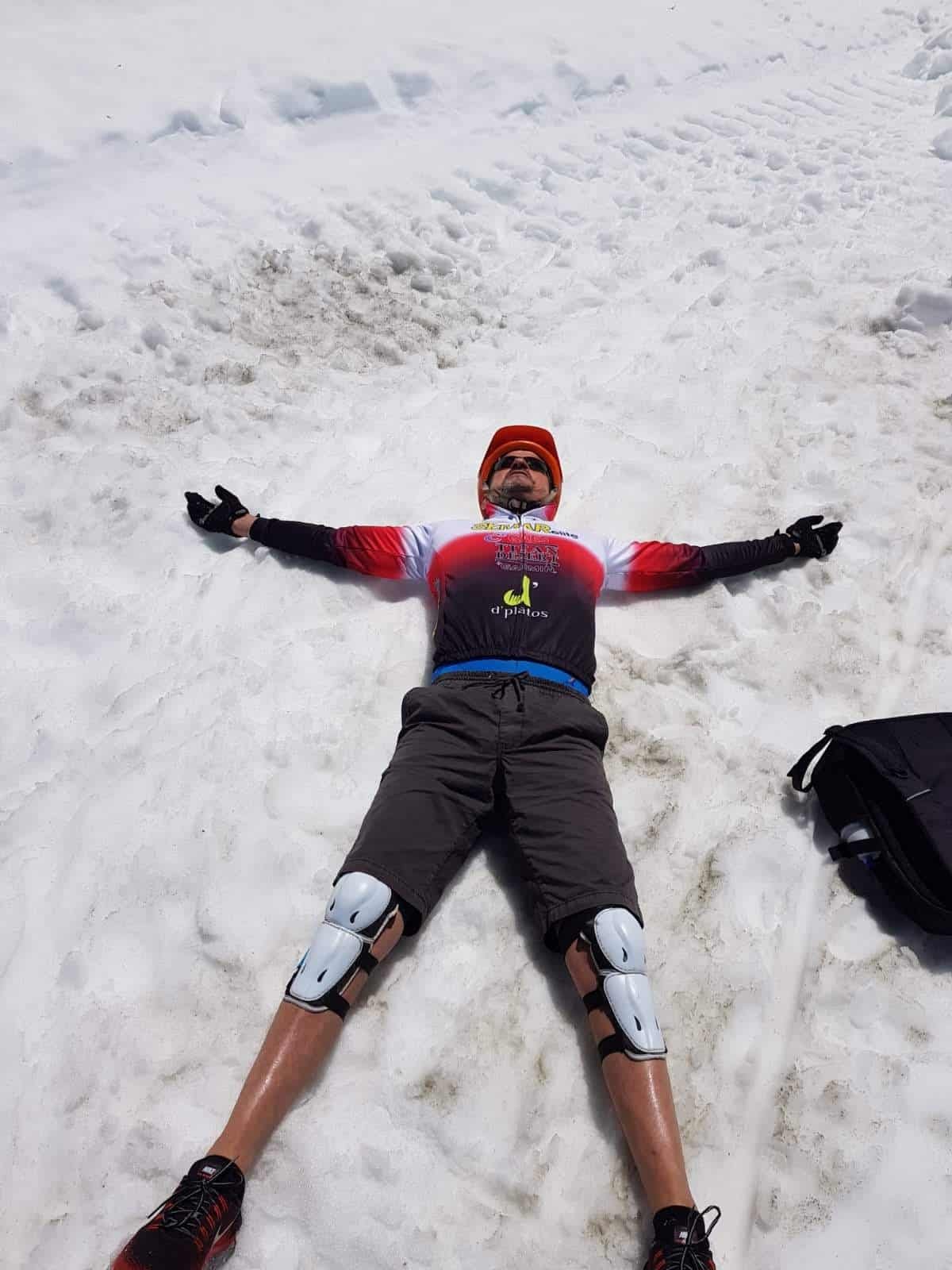Cuando estábamos a más de la mitad de nuestro recorrido nos encontramos con las famosas paredes de nieve de más de tres metros de altura y que todavía se mantenían en pie a pesar de las altas temperaturas. Podéis comprobarlo en el vídeo que hemos colgado en nuestra última publicación en Facebook. En ese momento nos dimos cuenta de que la situación se empezaba a poner seria y que cabía la posibilidad de no llegar a lo alto de la cima. Cruzamos un primer nevero que no nos causó mucha dificultad y a menos de 500m nos volvimos a encontrar con otro un poco más grande y que solventamos, gracias a la estimable ayuda de unos ciclistas profesionales de carretera que se encontraban por allí pero, llegó el tercero y más grande y fue en este último en el que Björn saco toda su fuerza física y mental y sin ayuda de nadie (no quiso que le ayudara) cruzó el pasillo de nieve que nos conectaría con el tramo final de la ascensión, debiendo detenernos justo en la zona de las Posiciones a una altitud de 3.000 mts y a tan solo 365 mts de desnivel de la cima.